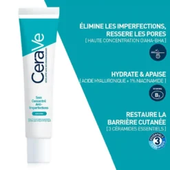 CeraVe Soin Concentré Anti-Imperfections 40 ML est formulé pour traiter les imperfections tout en respectant la barrière cutanée. Ce soin cible efficacement les boutons, les points noirs et les pores obstrués grâce à une combinaison d’acide salicylique, d’acide glycolique et de niacinamide. Les trois céramides essentiels restaurent la barrière cutanée, tandis que l’acide hyaluronique hydrate la peau. Ce soin est non comédogène, sans parfum, et convient aux peaux sensibles, même sujettes à l’acné.